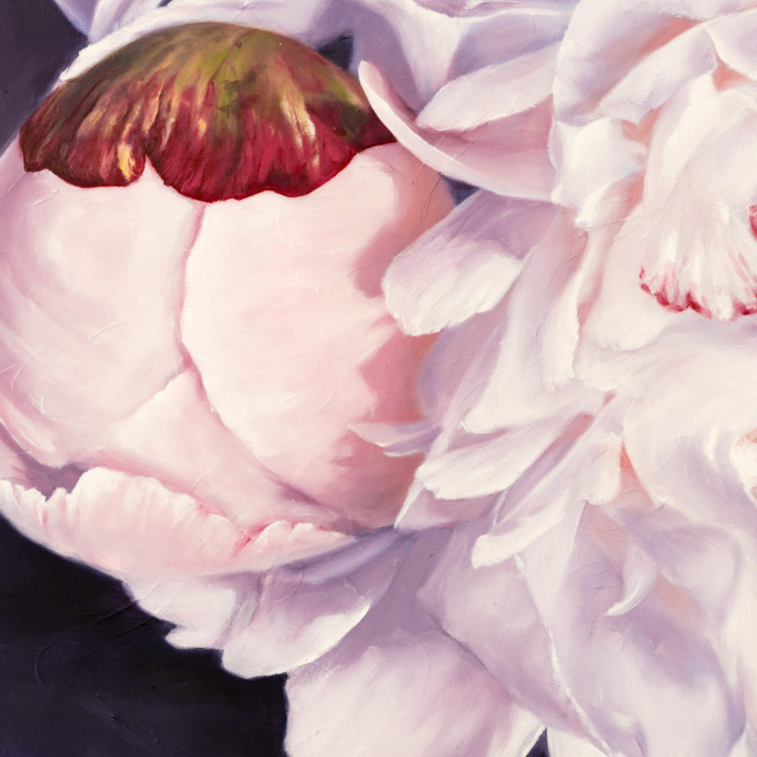 I’m drawn to peonies not only for their fleeting beauty, but for how they hold space for change. In this piece, the blooms are shown at different stages of opening—emerging slowly, each with its own rhythm. Like so much in life, they remind me that what is most meaningful often unfolds in silence, over time, without urgency.